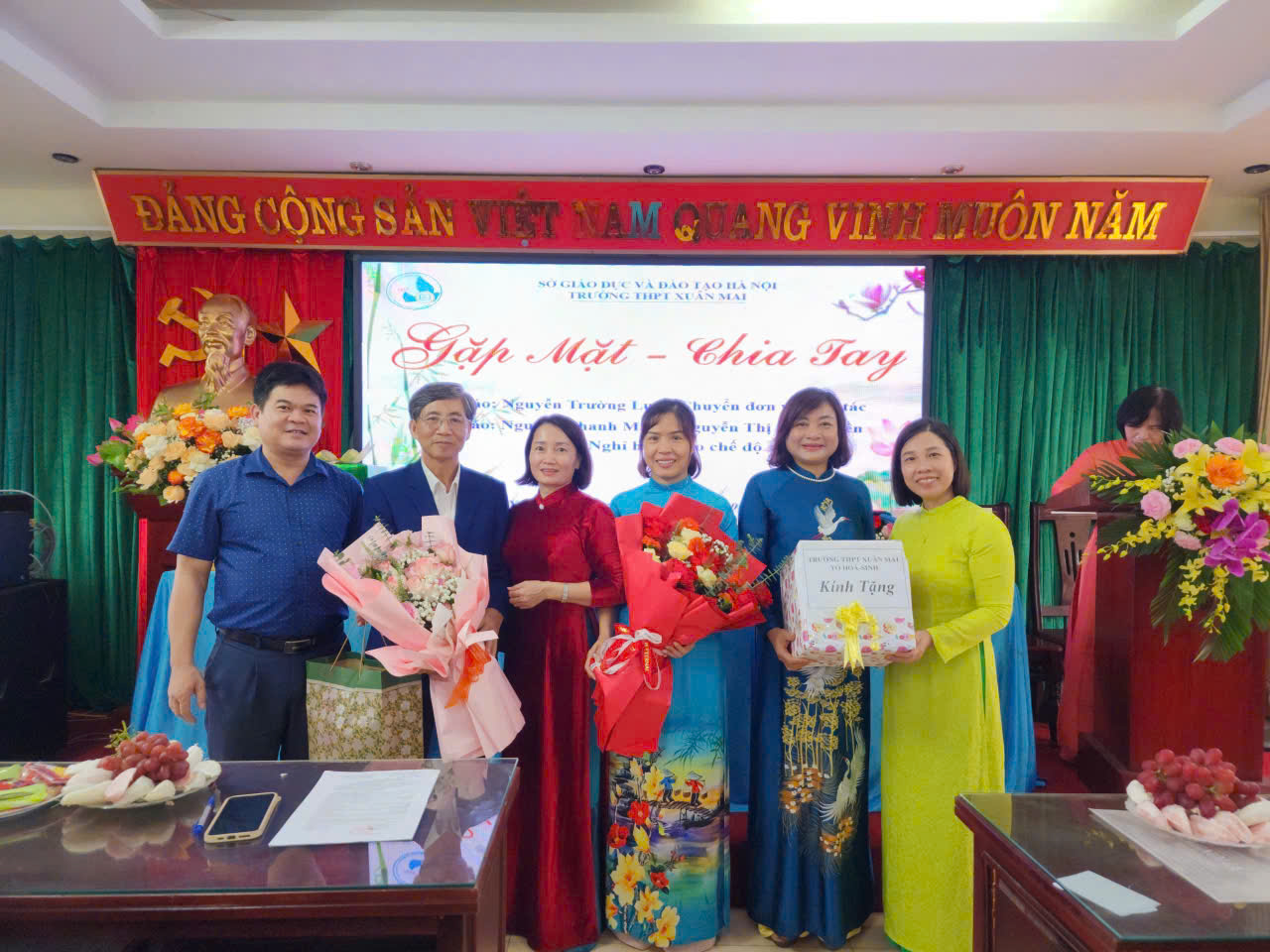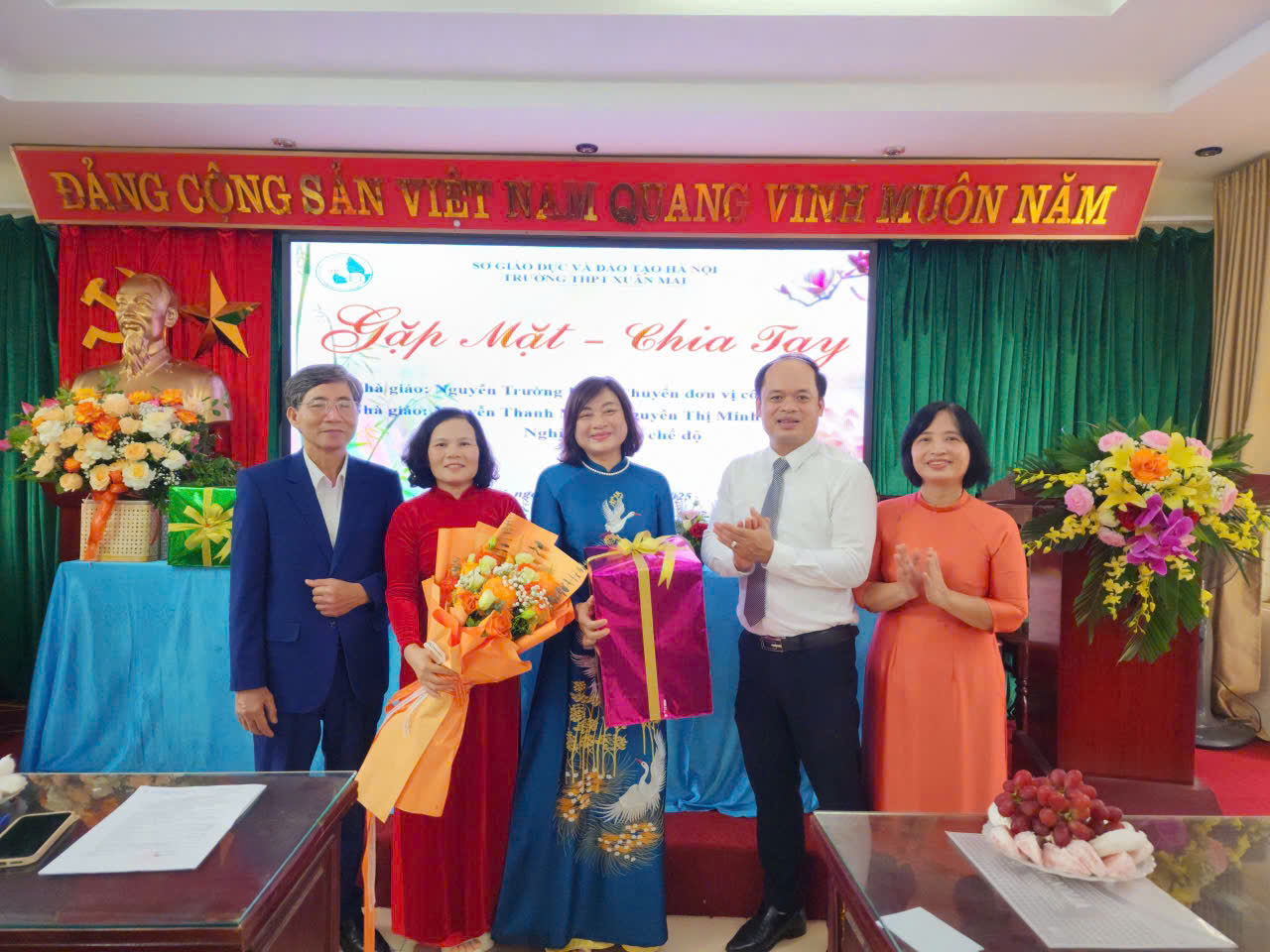 Sau khi hoàn thành các nội dung chính, Hội nghị chuyển sang phần gặp mặt chia tay đầy xúc động, tri ân những nhà giáo đã và đang chuẩn bị chuyển sang một chặng đường mới. Nhà trường đã tổ chức buổi lễ trang trọng để chia tay cô giáo Nguyễn Thị Minh Hiền và thầy giáo Nguyễn Thanh Mạnh - Hai nhà giáo về nghỉ theo chế độ. Phát biểu tại buổi lễ, cô giáo Lê Thị Phương Thảo- Phó hiệu trưởng nhà trường đã ôn lại quá trình công tác tận tụy, những đóng góp không mệt mỏi của cô Hiền và thầy Mạnh trong suốt nhiều thập kỷ gắn bó với sự nghiệp "trồng người" của trường THPT Xuân Mai. Các đồng nghiệp bày tỏ lòng biết ơn sâu sắc và gửi lời chúc tốt đẹp nhất đến hai thầy cô.