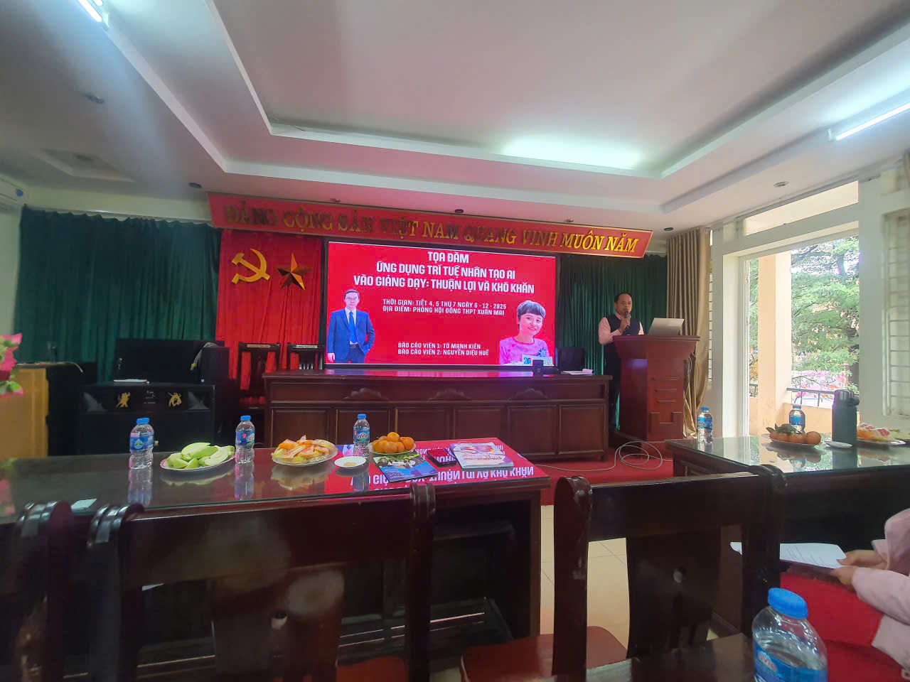 Với mong muốn trao đổi, học hỏi, giải đáp và bước đầu nâng tầm kỹ năng ứng dụng AI vào công tác giảng dạy cho các thầy cô. Được sự cho phép của ban lãnh đạo nhà trường, các thành viên Tổ Vật lý – Công nghệ đã tổ chức buổi tọa đàm ý nghĩa tại phòng hội đồng nhà trường vào ngày 6/12/2025.